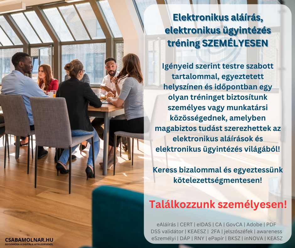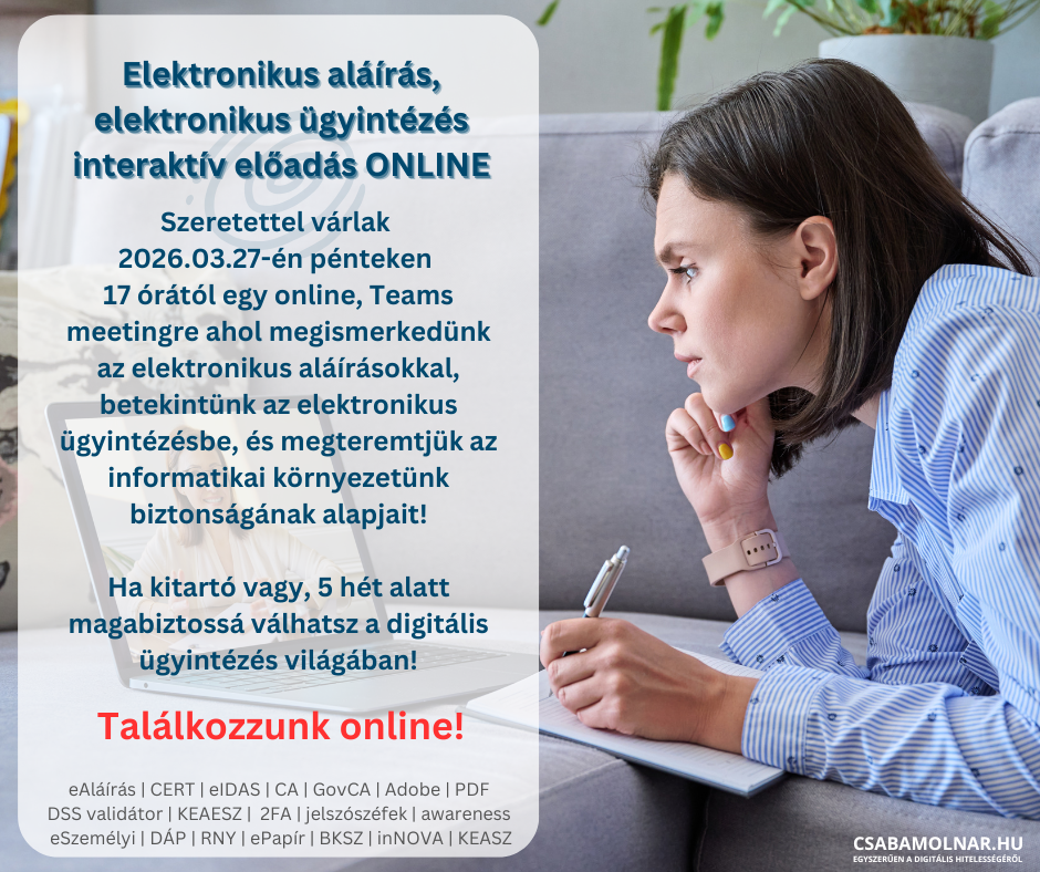 A mindennapi ügyeink elmozdultak a fizikai térből a digitális világ felé. Egyre több szolgáltató online tartja a kapcsolatot az ügyfeleivel, elektronikusan számláz, és biztosít az ügyeink elintézésére webes-, vagy mobilalkalmazás alapú platformot. Mindehhez azonban legalább e-mail fiók és szolgáltatásonként egy-egy felhasználói fiók (account) szükséges, amelyeket már nem elégséges a jól megszokott, egyszerű felhasználónév és jelszó párossal védenünk. A két-, vagy többfaktoros védelem (2FA/MFA) mellett arra is egyre nagyobb az igény, hogy hitelesen tudjuk intézni ügyeinket, így személyazonosságunk igazolása (eAzonosítás) és digitális aláírásunk hitelessége (eAláírás és időbélyegzés) mára olyan digitális képesség, amely egyre inkább alapkövetelmény az ügyintézés és az online munkavégzés során.