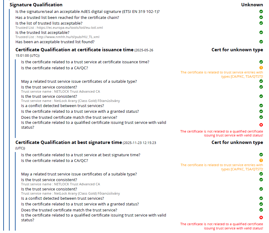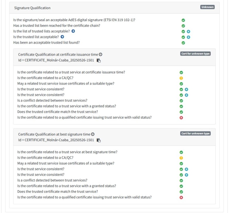 Ugyanezen dokumentumról részletes riport is készült, amely pdf-be exportálva 7 oldalnyi információt közöl az aláírás és az időbélyeg jellemzőiről. Webes környezetben a szövegezés egyszerűen lefordítható magyar nyelvre, az adatsor végén lévő flag-re (sárga felkiáltójel, piros x, kék +) rámutatva részleteket is megtudhatunk az adott jellemzőről. Ebből néhány adatsor szemléltetésül: