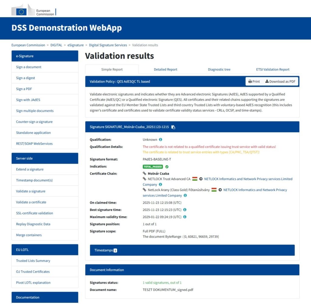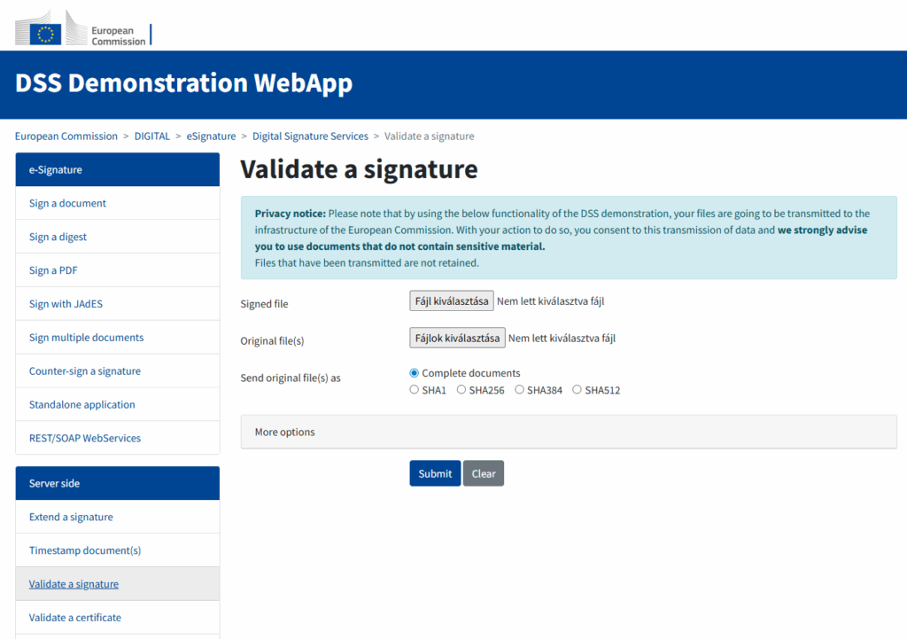 Az Európai Bizottság által biztosított DSS Demonstration WebApp egy olyan aláírás-ellenőrző szolgáltatás, amely az Európai Bizottság infrastruktúrájában végzi el a feltöltött fájlba ágyazott elektronikus aláírások és időbélyegek validálását – akár az eredeti fájlokkal történő összehasonlítással is. A validálás folyamata testreszabható, számos beállítási lehetőség közül választhatunk.