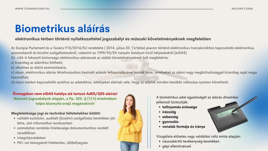 A digitális környezetben rögzített aláíráskép, a biometrikus aláírás önmagában nem eredményez eIDAS hatálya alá tartozó fokozott biztonságú (AdES), vagy minősített (QES) elektronikus aláírást, azonban az alábbi – hazai – jogszabályi követelményeknek való maradéktalan megfelelés eredményezhet teljes bizonyító erőt.