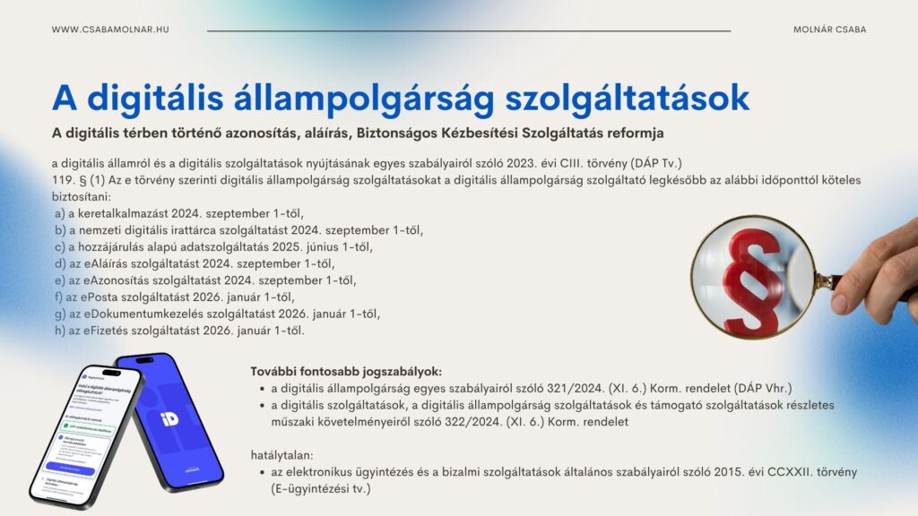 A ⚖️ DÁP tv. a digitális állampolgárság szolgáltató részére lépcsőzetes bevezetést határoz meg az egyes szolgáltatások kapcsán, ebből látható, hogy miként újul majd meg a mindennapjaink digitalizációja. Nem szabad megfeledkeznünk a bizalmi szolgáltatókról és az általuk kiállított tanúsítványokról, az állami szervek ügyintézést támogató online szolgáltatásairól, és a piaci szereplők szolgáltatásainak digitalizációjáról sem. 💡 Ügyeink jelentős része már intézhető online, fontos azonban ismernünk az erre rendeltetett hiteles csatornákat – többek között ezek bemutatásra vállalkoztam előadássorozatom felépítése során.