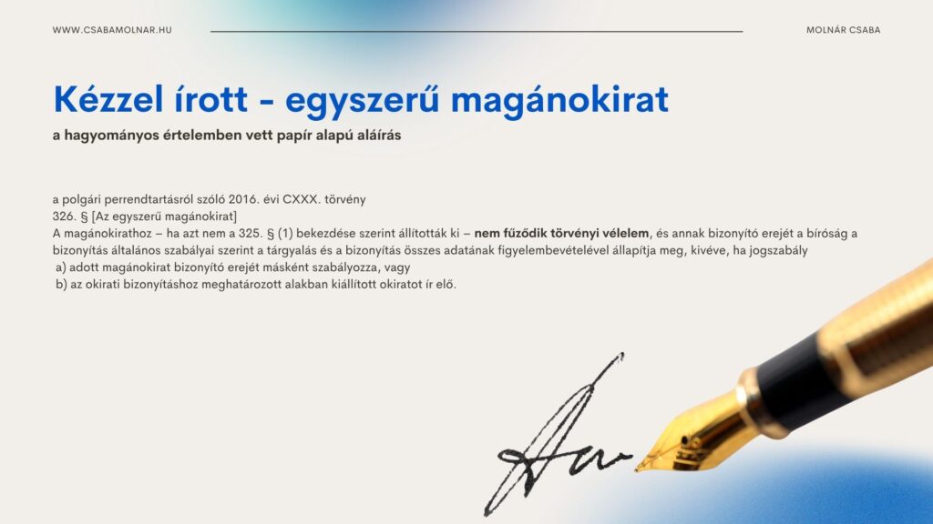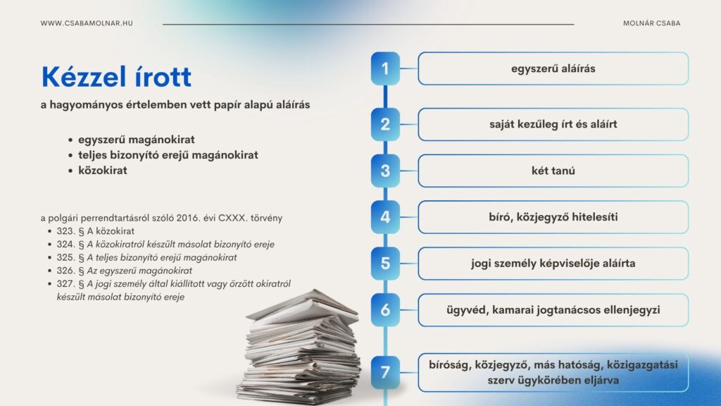 Nem elsősorban a jogi megközelítés, inkább a rendszerszintű megértés érdekében ⚠️ érdemes megkülönböztetnünk a kézzel (alá)írott dokumentumok kapcsán 📌 egyszerű magánokiratot, 📌 teljes bizonyító erejű magánokiratot, és 📌 közokiratot – utóbbi kissé kilóg a sorból.