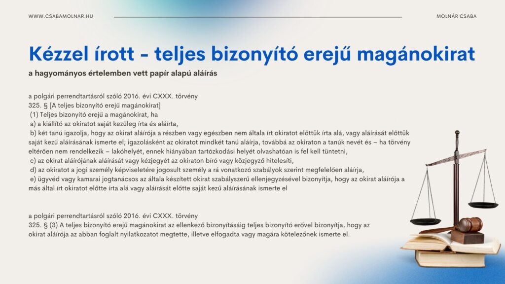 Elérkeztünk a 🎯 teljes bizonyító erejű magánokirathoz. ⚠️ Ehhez már törvényi vélelem fűződik, tehát a bizonyítási teher megfordul, így az ellenkező bizonyításáig a benne foglaltakat teljes bizonyító erővel bizonyítja. Az okirat akkor bír teljes bizonyító erővel, ha megfelel a ⚖️ polgári perrendtartásról szóló törvényben foglaltaknak, így különösen 💡a saját kézzel írt és aláírt okirat, a két tanú aláírásával ellátott okirat, közjegyzői vagy bírói hitelesítés, ügyvédi ellenjegyzés esetén, és ami számunkra leginkább érdekes, az ✅ elektronikusan aláírt dokumentumok a megfelelő tanúsítvány alkalmazása esetén – amelyről később részletesen ejtünk szót.