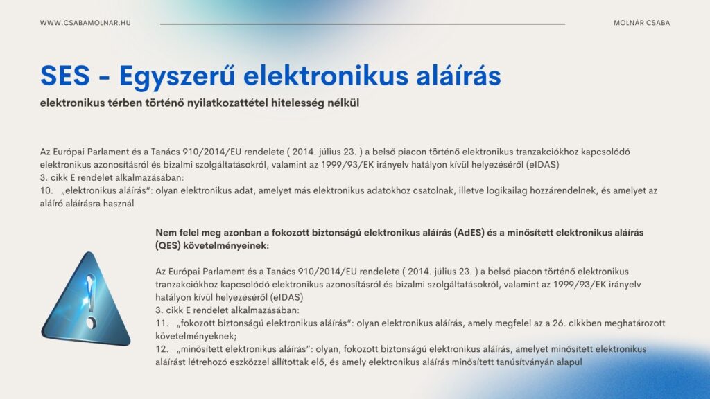 ⚖️ Az „egyszerű elektronikus aláírás”: az eIDAS Rendelet 3. cikk 10. pontjában meghatározott olyan aláírás, amely nem felel meg az eIDAS Rendelet 3. cikk 11. és 12. pontjában meghatározott követelményeknek.