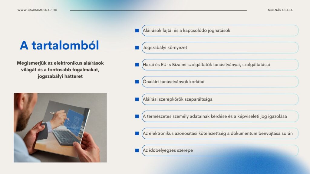 Kérlek engedjétek meg, hogy a kilenc előadásból és egy workshopból álló, több száz oldalnyi prezentációval szemléltetett online előadássorozatot, és személyesen tartandó tréninget – illetve azok tematikáját – az alábbi menüpontokban röviden bemutassam számotokra, amely végig vezet az elektronikus aláírások – nem is olyan – kusza világának megismerésén, egészen a mindennapi online ügyintézésig.
